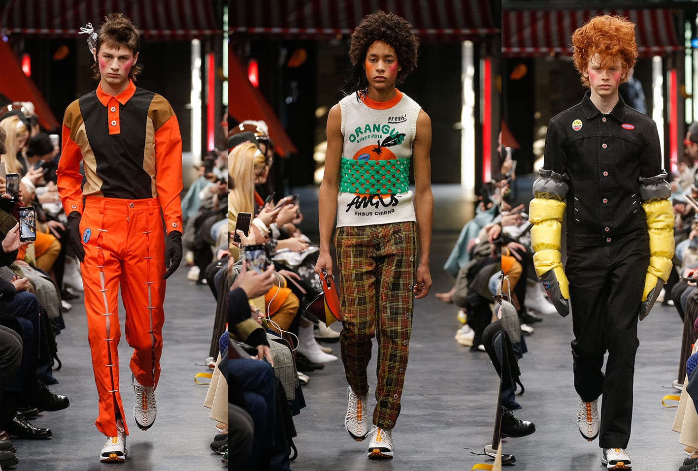 Angus Chiang, a présenté la collection automne-hiver 2019/20 à Paris. Le podium a été transformé en un marché des fruits et légumes.  Une collection inspirée des vêtements de travail quotidiens utilisés dans l’agriculture, la pêche et l’élevage, en plus des «combinaisons de grenouilles» portées par les pêcheurs.