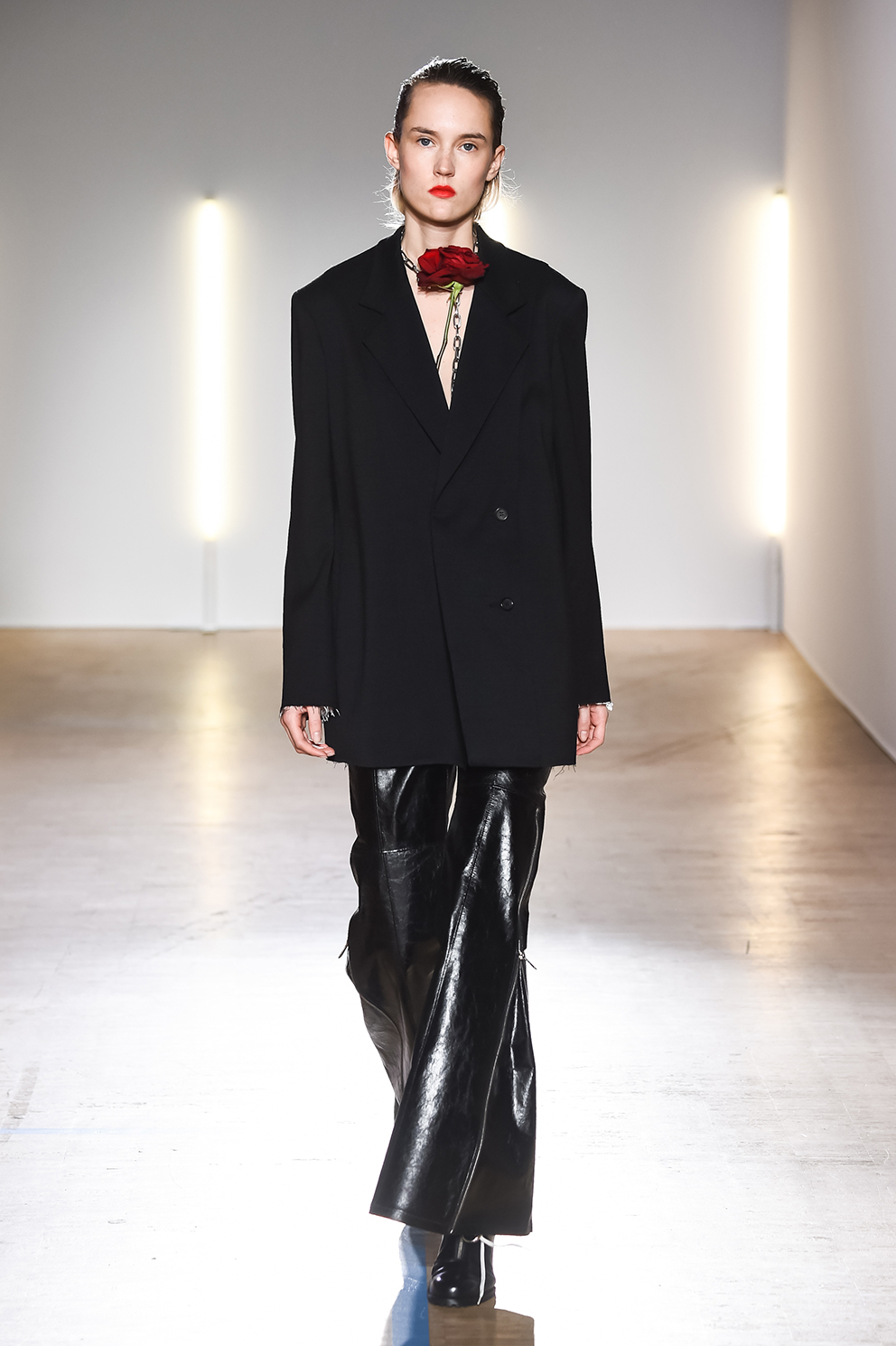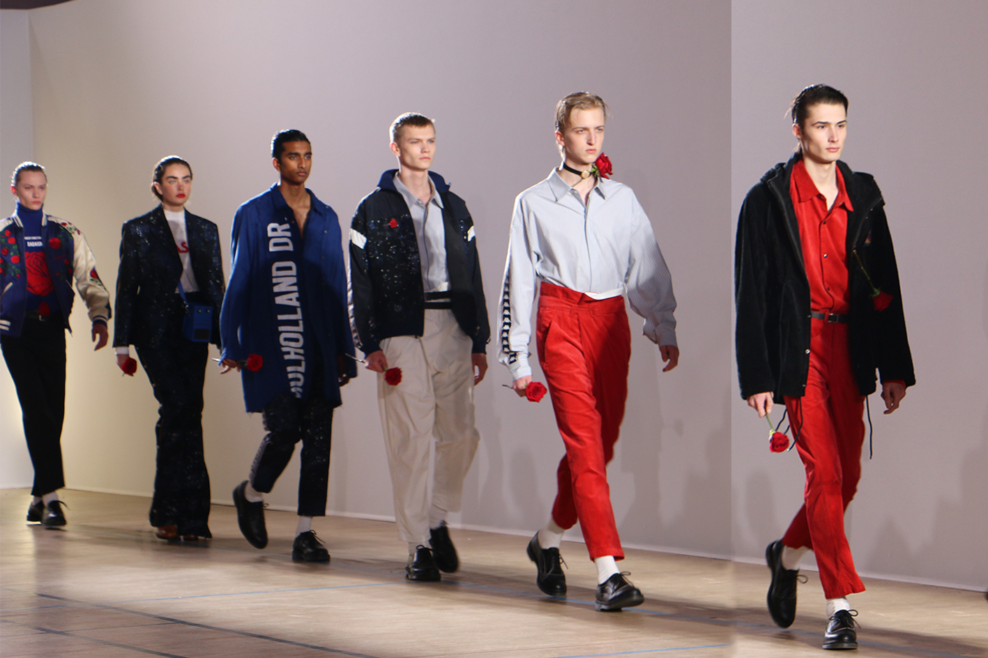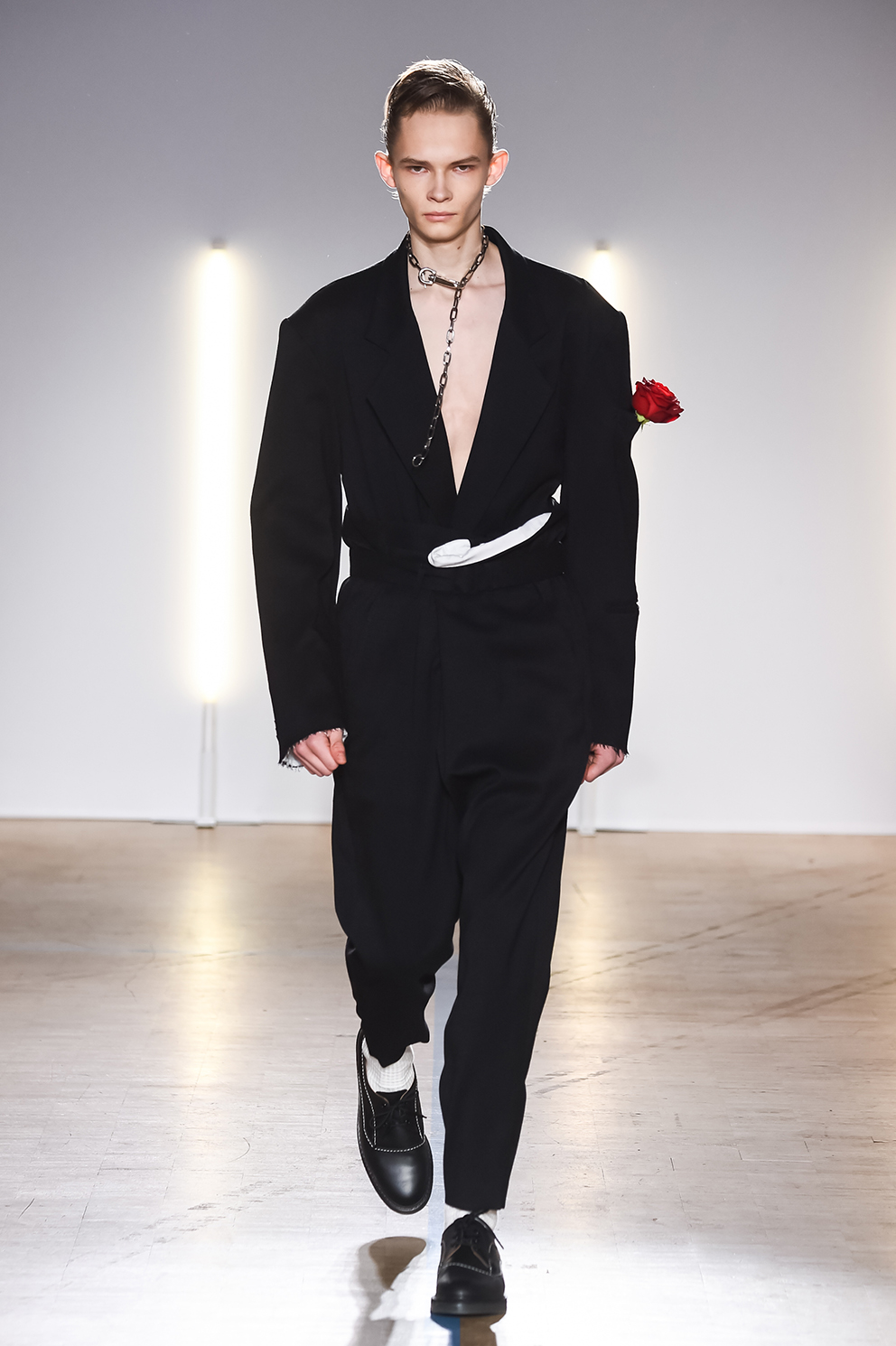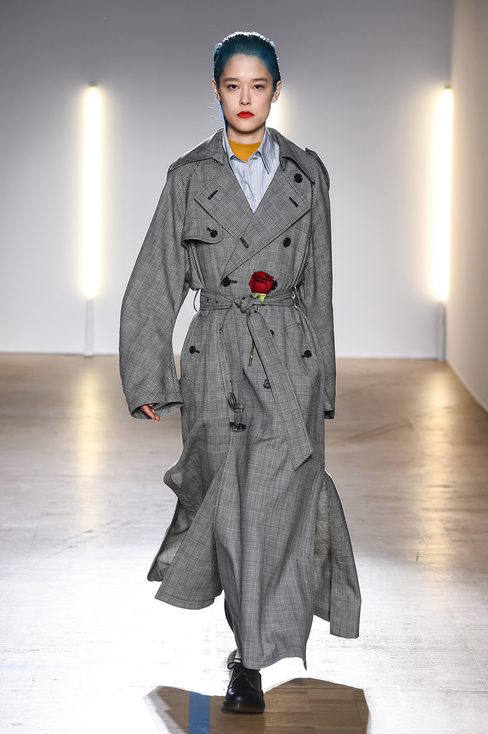 L’œuvre de l’artiste américain David Lynch a initié nombre des motifs marquants de la collection : un motif de roses rouges brodé sur les blousons de satin ou tricoté sur des pulls reprend le graphisme d’une affiche du film Blue Velvet. Développant toujours un vocabulaire esthétique personnel, Morikawa mixe les influences du vestiaire asiatique avec les classiques d’une garde-robe occidentale. Les vestes de tailleurs sont coupées avec des cols de kimonos, dans un geste élégant empreint d’un chic ethnique.