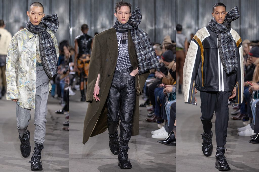 Avec une palette inspirée par les tons dé saturés de décomposition et de détérioration, les verts de mousse, les kakis et les noirs sont infusés de tons jaune acide et caramel, et de sur bottes en surplus de caoutchouc militaire noir offrant des chaussures de protection.