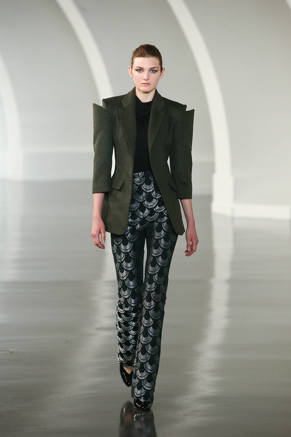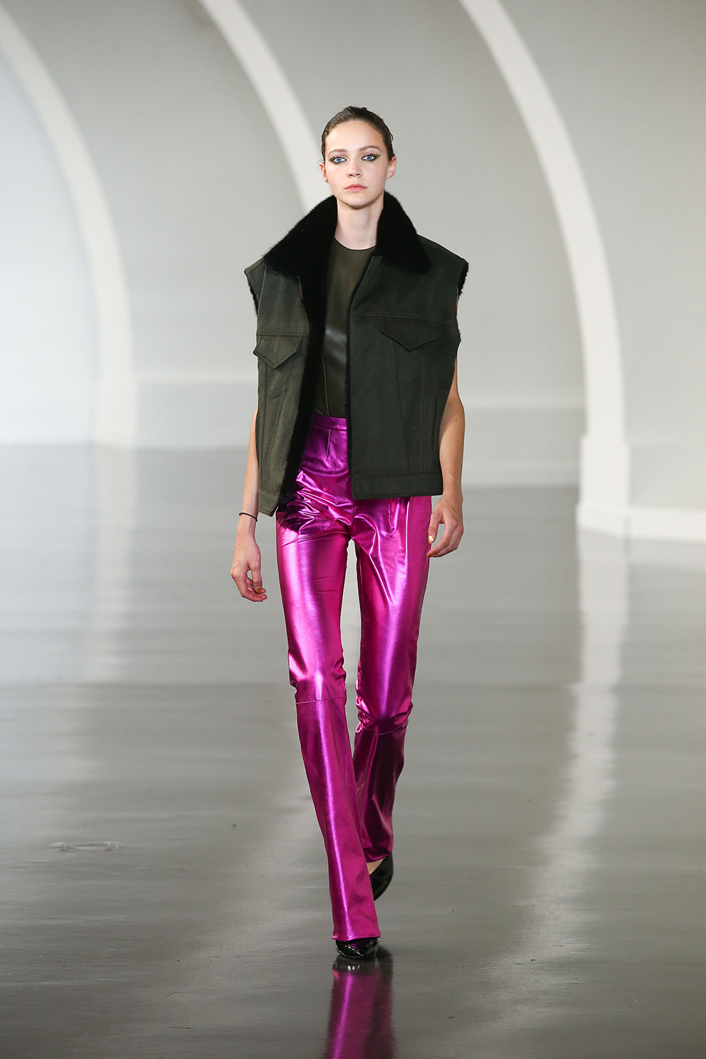 Une collection aux volumes ultra travaillés ; sur les vestes, les jeux d’épaules prennent de la hauteur tandis que les bretelles des longues robes soyeuses s’amenuisent pour des silhouettes à l’évanescence Nineties twistées. Une palette de couleurs pures : noir, vert kaki, fuchsia électrique, rouge éclatant.