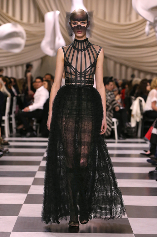 Never trust the first impression … Thus, the large folds of the white evening dress edged with black open like pages, like a book; the cage, a recurrent motif of surrealist works, is transfigured into a network of black tubular fabric that encloses the body and emphasizes the play of transparency, while a fishing net made of silver thread mingles with the density of velvet.