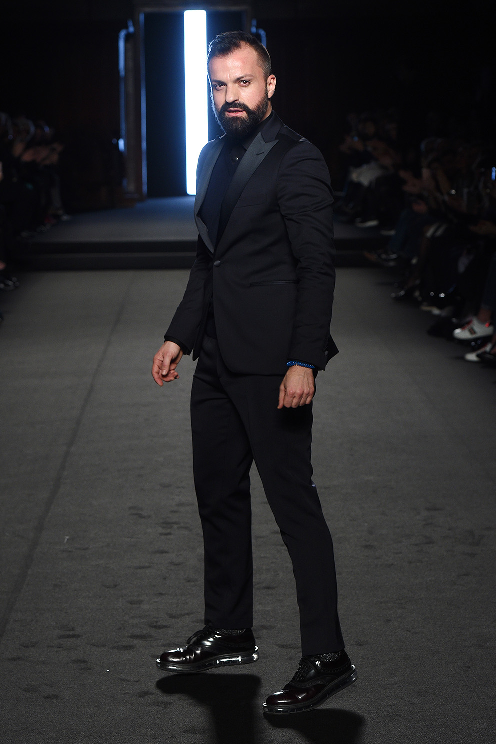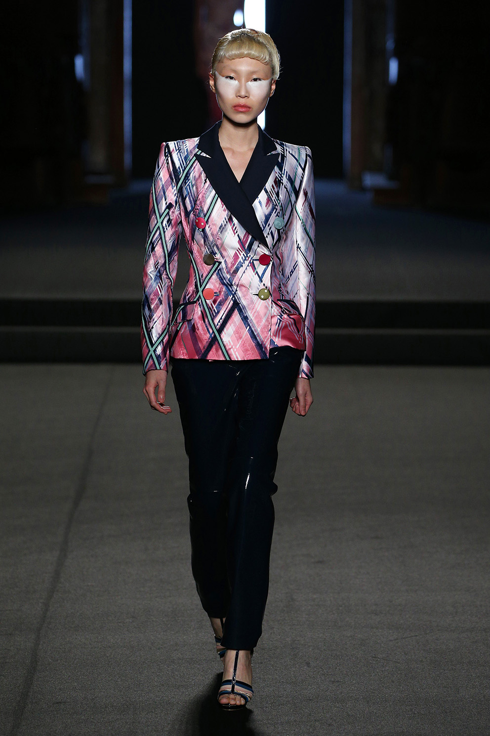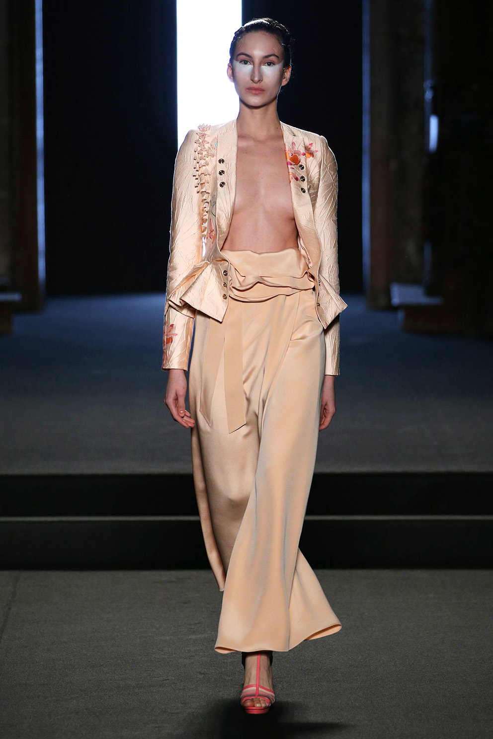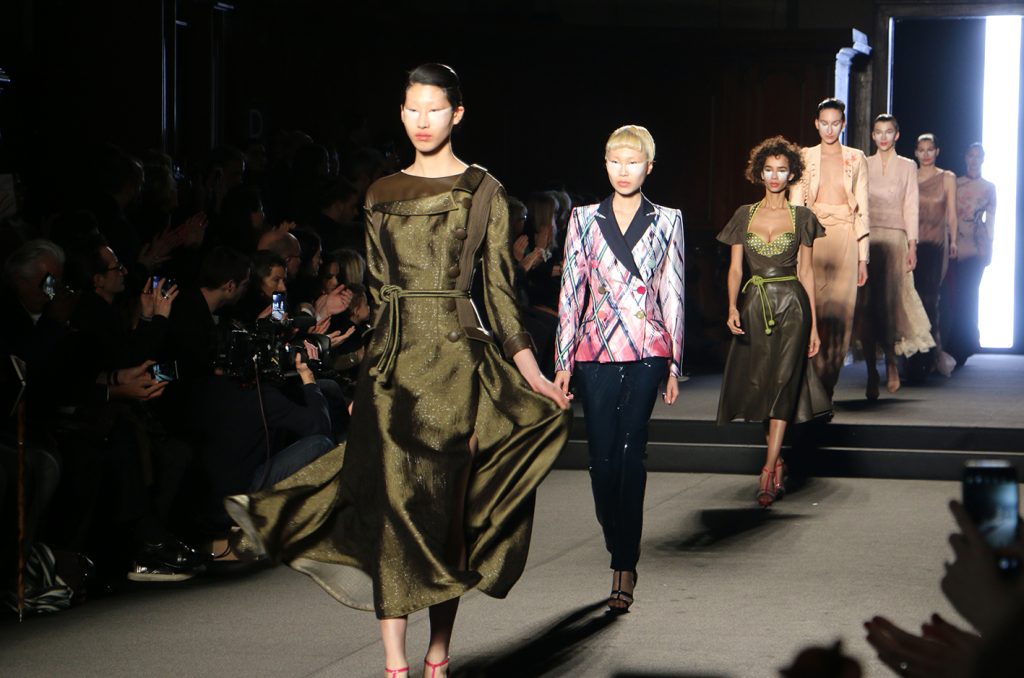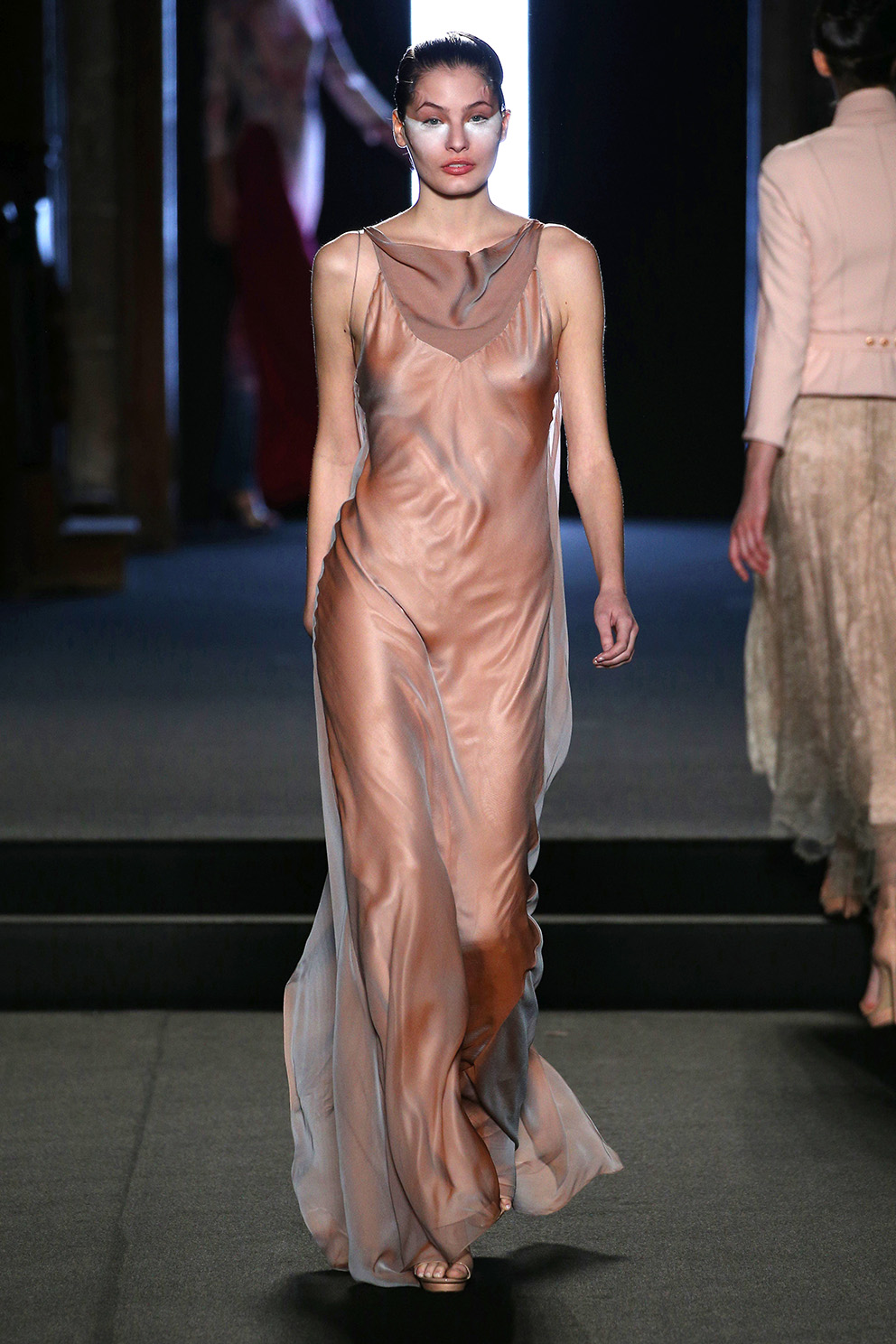 Le drap de soie s’impose et sculpte les corps dans des coupes près du buste dont les emmanchures font la part belle aux secrets de la Haute Couture. Le cuir s’immisce ici ou là pour acérer la taille ou fuseler la jambe. Chaussées de salomés à multi-brides en kaléidoscope de cuirs aux couleurs de la saison, les mannequins s’élancent sur un rythme soutenu. Maquillage, coiffure, lumière, musique confirment le caractère futuriste de cette esthétique.