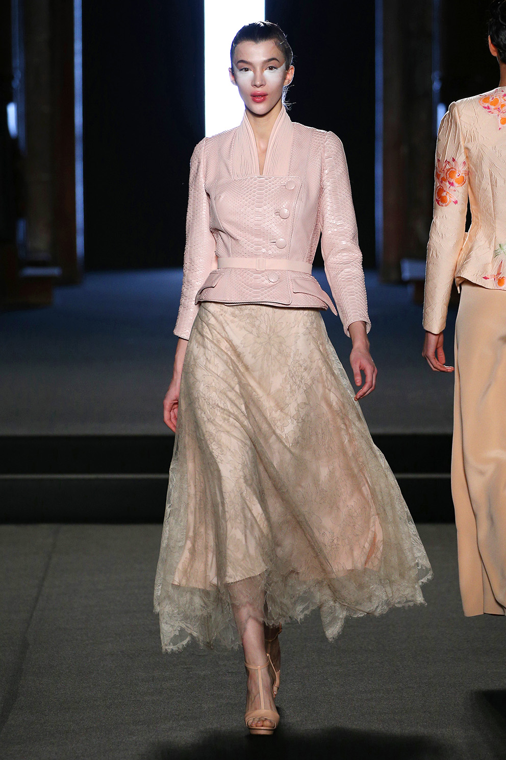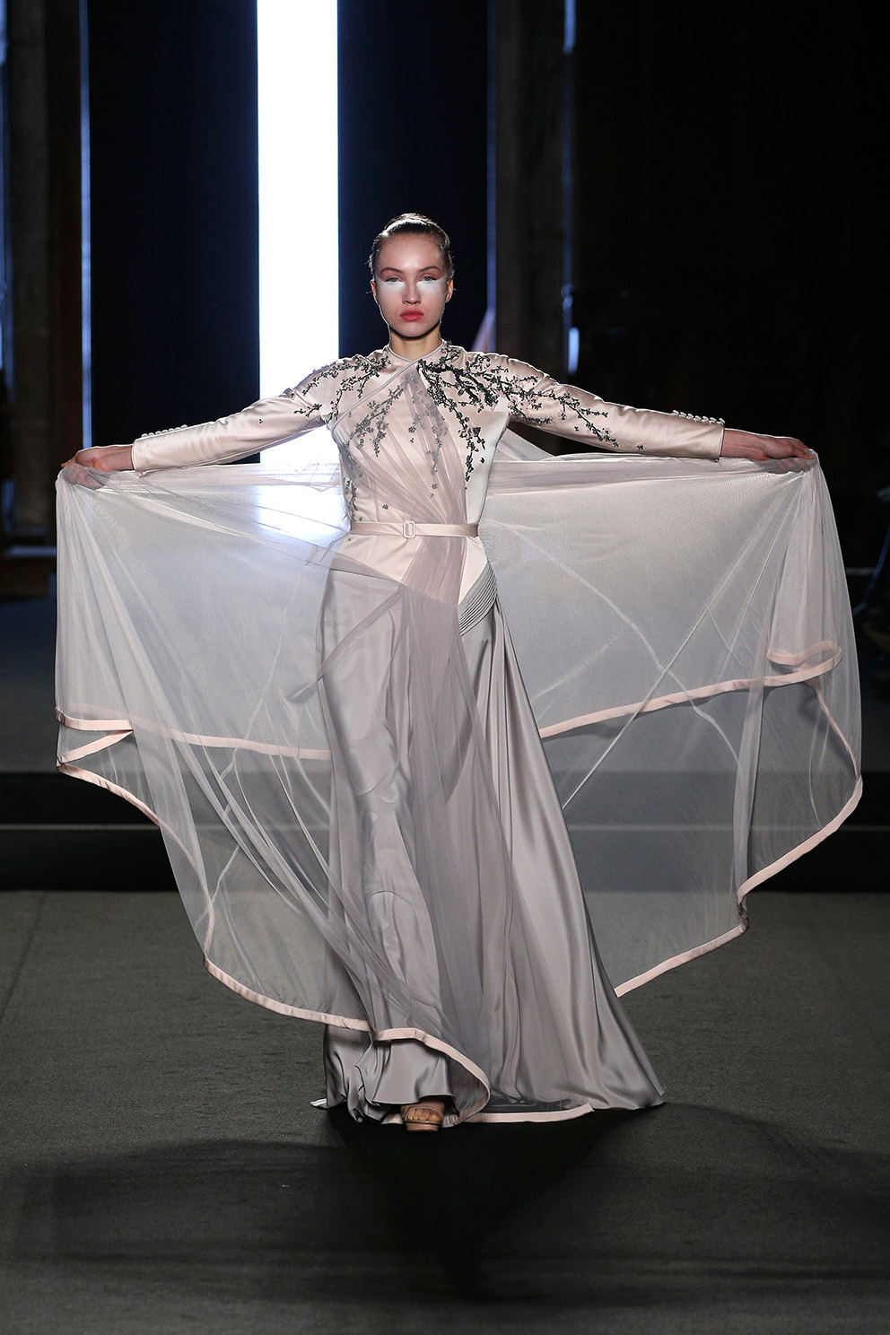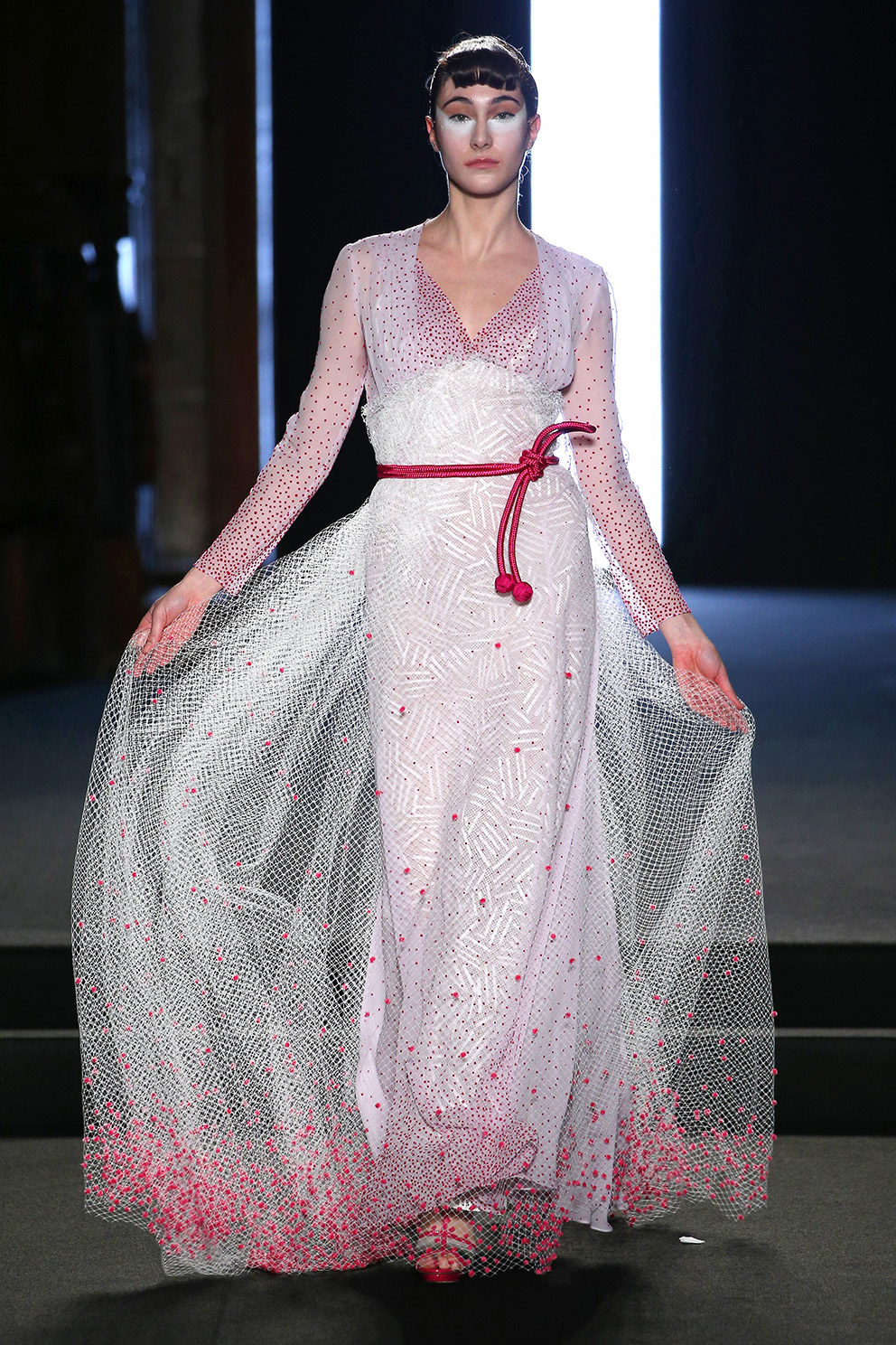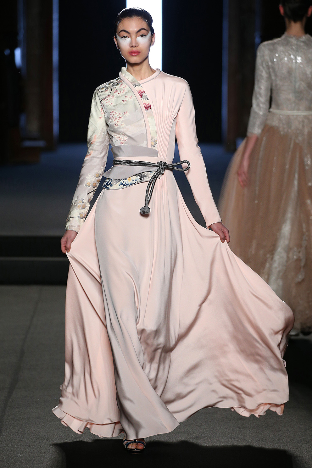 La Haute Couture joue ici avec les codes pour mieux les transcender en osant le pois sur un serre-taille de tradition asiatique, en ornant de tuyaux d’orgue un fourreau « cheongsam », en ajoutant à une basque les reliefs d’une obi, en brodant sur une robe quelques glycines recréées dans le même tissu, façon véritable origami de geisha. La palette s’interdit le noir et favorise les tons poudrés, les dégradés du bambou et les brillances rosées, voire le reflet de la laque. Les transparences des tulles et des dentelles privilégient les superpositions et tamisent délibérément les brillances pour davantage de pudeur.