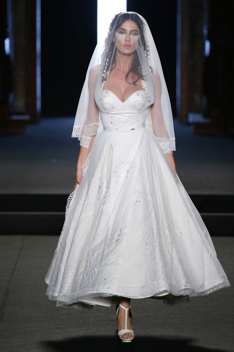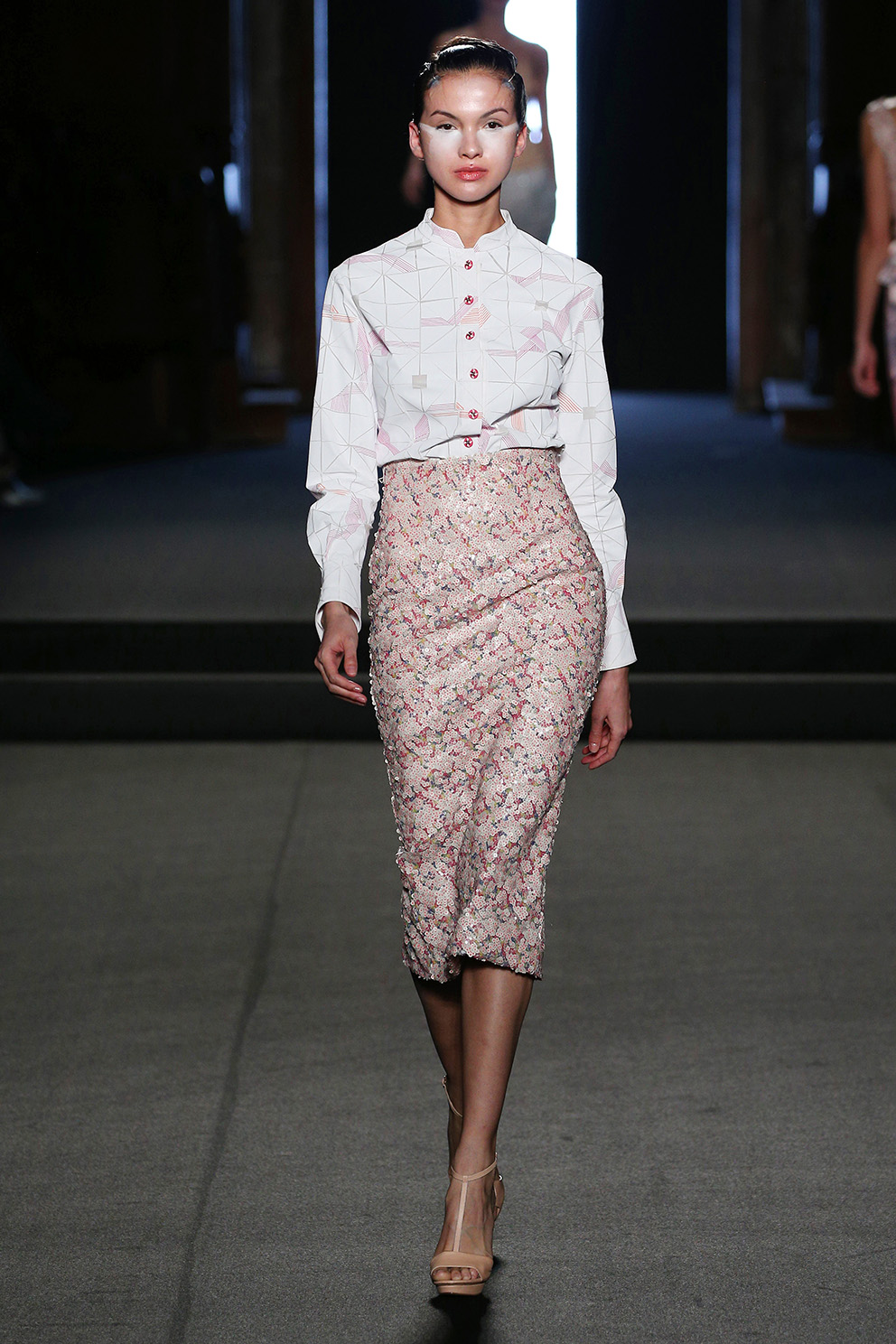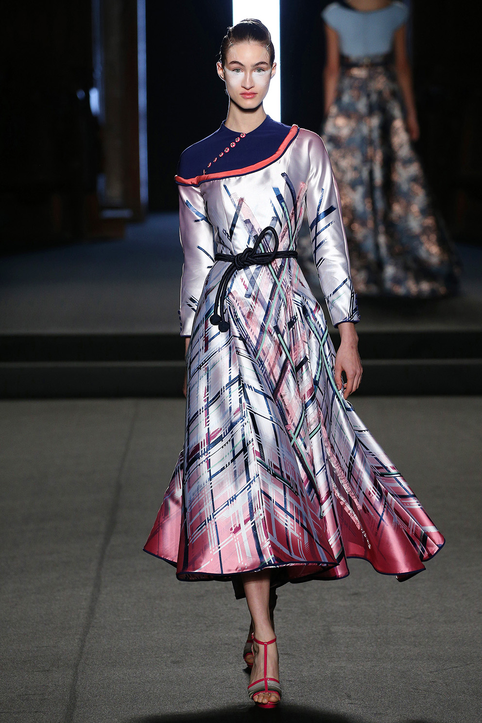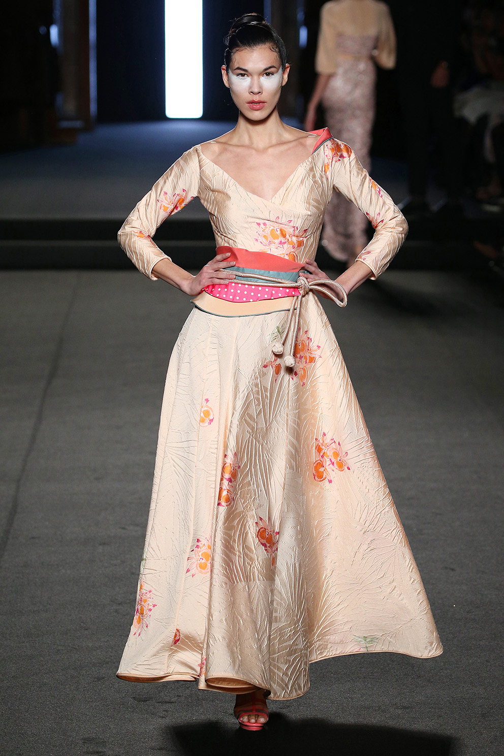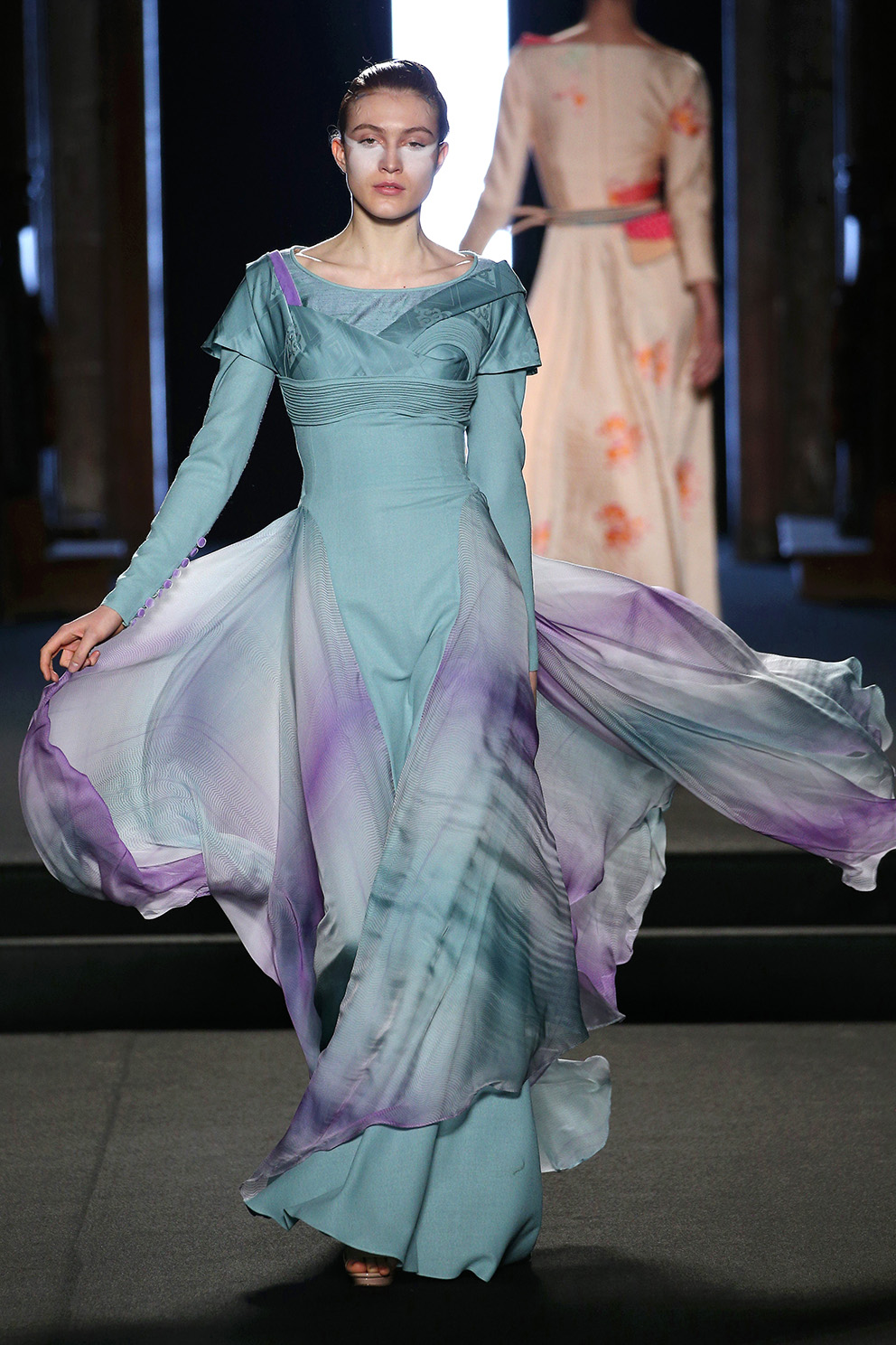 La Haute Couture joue ici avec les codes pour mieux les transcender en osant le pois sur un serre-taille de tradition asiatique, en ornant de tuyaux d’orgue un fourreau « cheongsam », en ajoutant à une basque les reliefs d’une obi, en brodant sur une robe quelques glycines recréées dans le même tissu, façon véritable origami de geisha. La palette s’interdit le noir et favorise les tons poudrés, les dégradés du bambou et les brillances rosées, voire le reflet de la laque. Les transparences des tulles et des dentelles privilégient les superpositions et tamisent délibérément les brillances pour davantage de pudeur.
