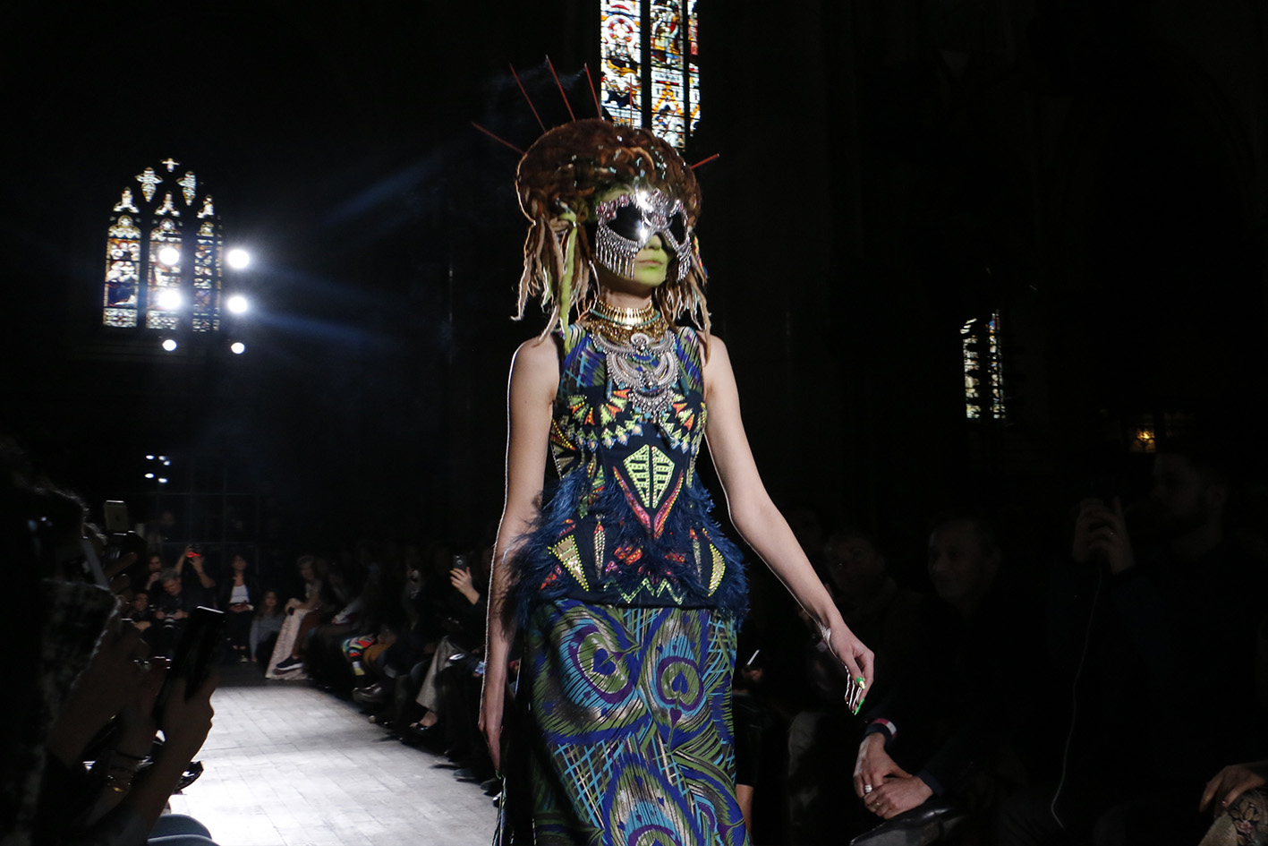Manish Arora, a présenté sa nouvelle collection automne-hiver 2019/20 à Paris. Cette collection comprend un cru bigarré de bohèmes Mad Max tout droit sortis d’un avenir dystopique. Protégés par des visières réfléchissantes incrustées de pierres précieuses, des androïdes apocalyptiques balayent des paysages désertiques poussiéreux dans des tons sablonneux et des tranchées longues et léchées de flammes, recouvertes de graffitis.
