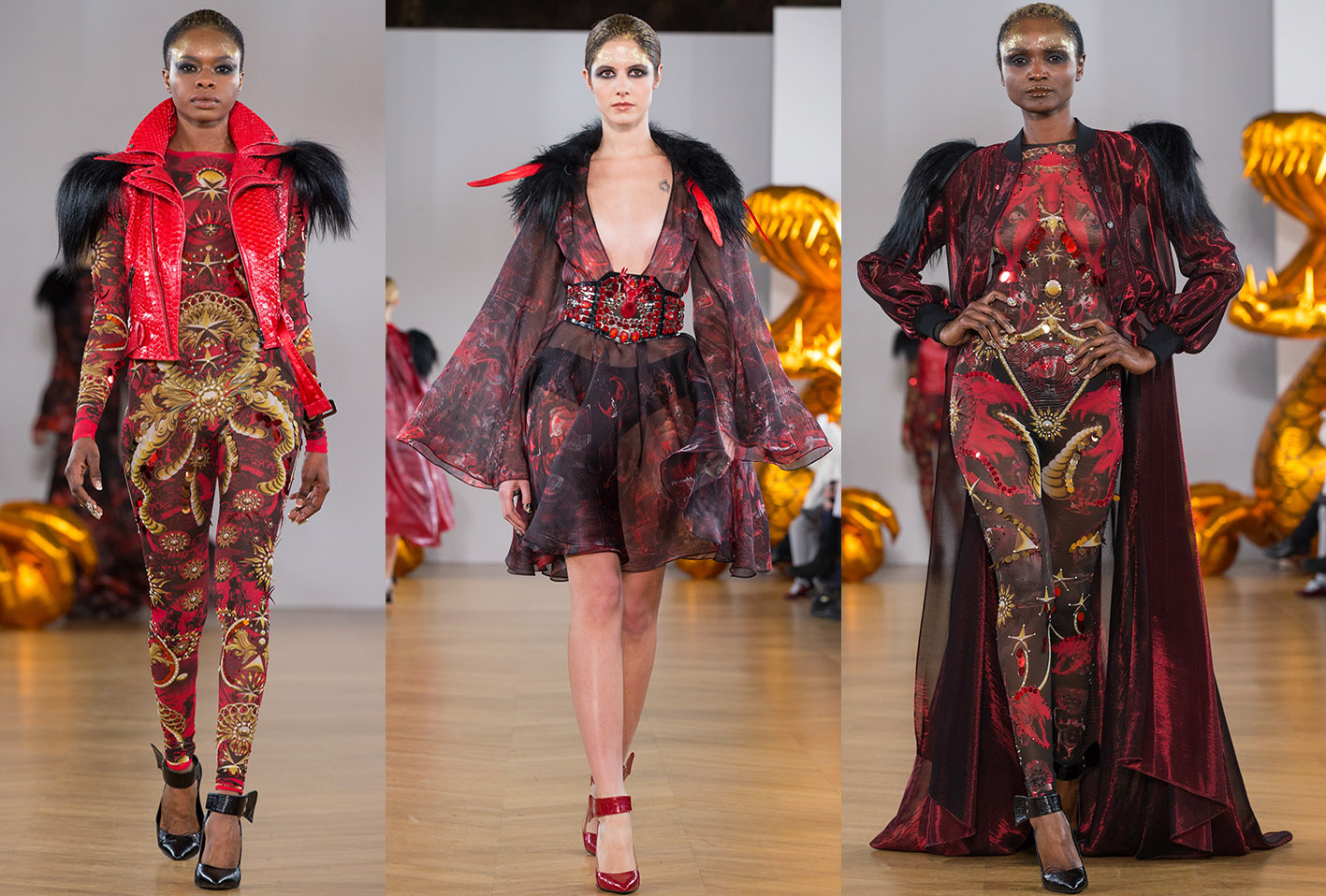 Une collection magique, mystique et lumineuse. Une alchimie spontanée et intuitive. Des robes longues noires sublimées par des ceinture bijoux argentés, le rouge est une couleur dominante de la collection, des matières nobles et légères ou là encore les silhouettes sont mises en valeurs, parfois avec de grosses ceintures bijoux, parfois avec des fourrures luxueuses. On a adoré les robes courtes élégantes ainsi que les manteaux majestueux.