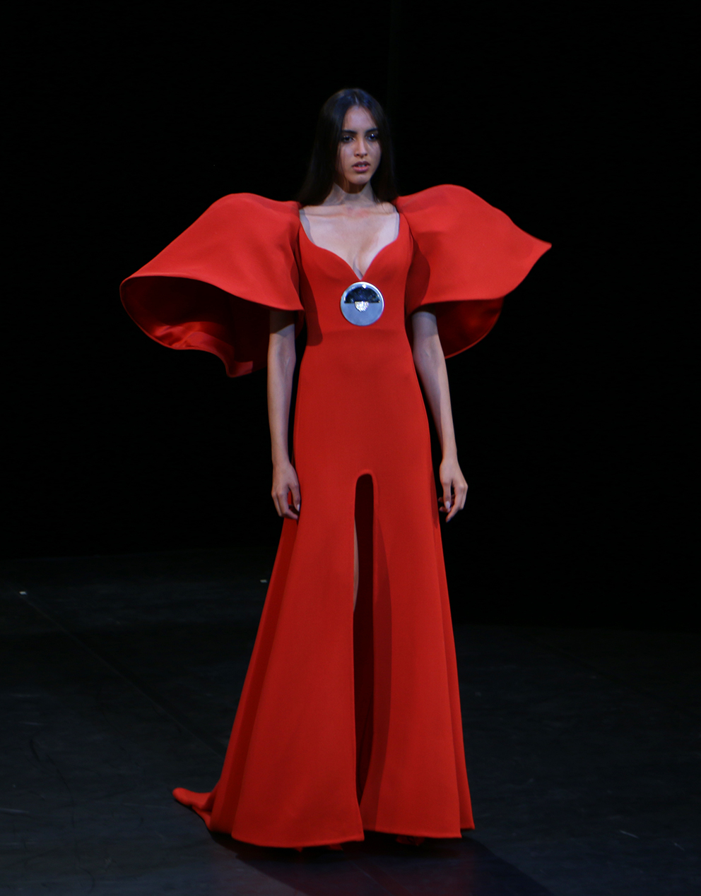 The search for the perfect silhouette stretches throughout the collection, just as the long Rolland dresses that flare the ankles lengthen the figure. The cuts are minimalist, refined, but far from austere, split-cut dresses and pure effects adding a seductive allure to the looks in which emotion is shaped by art. The foliage motif is a return to Calder’s mobile sculptures, a corset cleavage is decorated with Art Deco design, a sculpted scalp has a tribal totem feel. The jewelry is woven into the dresses, its powerful presence is the mark of a strong personality.