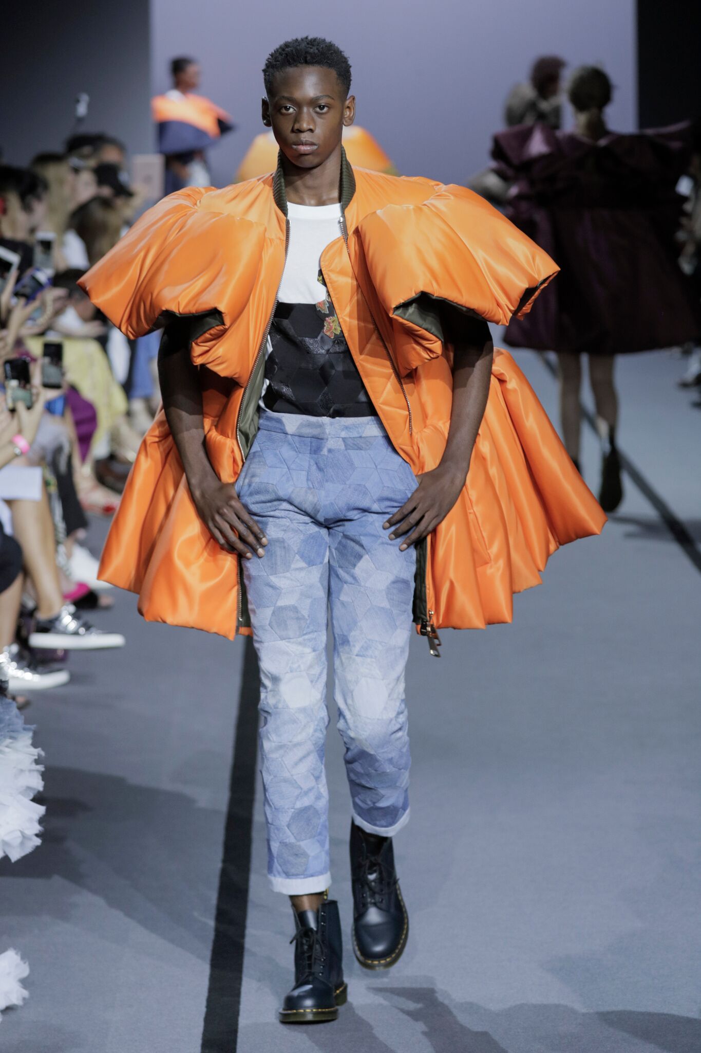 Une conception des vêtements dans tous les sens matières, volumes et couleurs. Un arborait un collier ruff géant, type anorak en nylon, bien que la robe semblent parfois fait avec tous ces détails sont faites à la main. La deuxième partie a continué sans la tête géante et les bombardiers décompressés sur denim patchwork couture Streetwise et T-shirts. Un vrai spectacle sur une collection facile à porter.